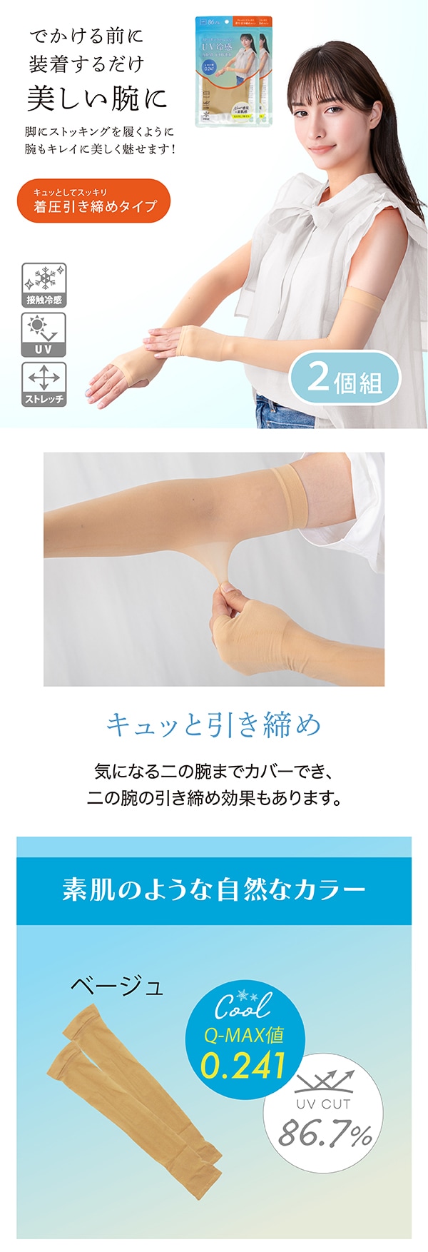 【ベージュ/着圧タイプ 2個組】ストッキングのようなUV冷感アームカバー | 出かける前に装着するだけ美しい腕に