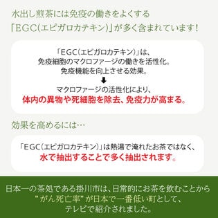 水出し茶には免疫細胞「マクロファージ」の働きを活性化させ、体内の異物や死細胞を除去し、免疫機能を向上させる効果があるとされる「EGC(エピガロカテキン)」が多く含まれています。「EGC」は、水で出すことでより多く抽出できます。