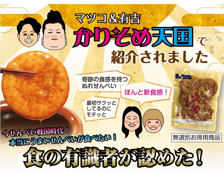 ・原材料/材質/素材:うるち米(国産)、しょうゆ(小麦・大豆を含む)、還元水飴、砂糖、発酵調味料、酵母エキス/トレハロース、調味料(アミノ酸等)、酸味料、カラメル色素