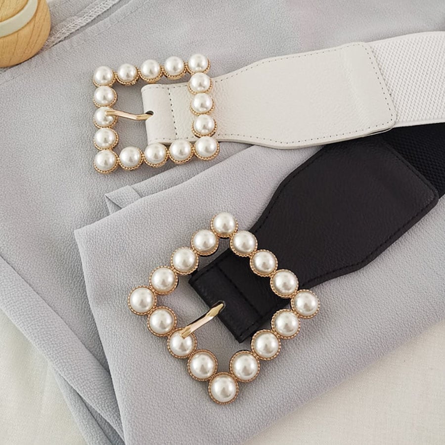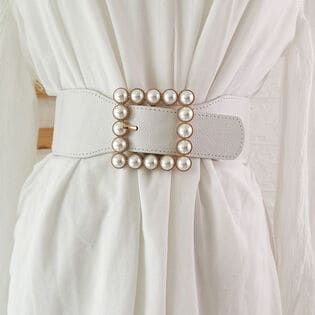 - 【ホワイト】フェイクパール 幅広ゴムベルト