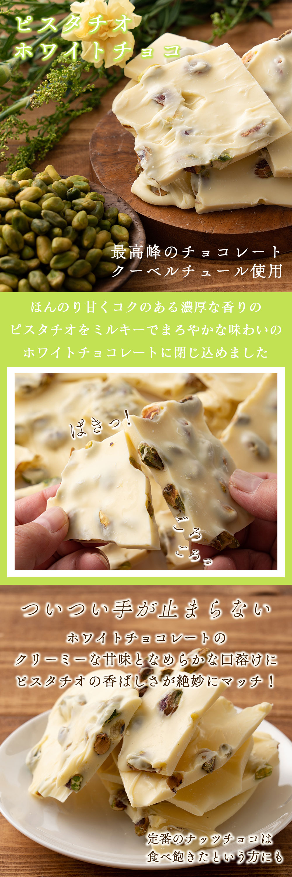 【1440g(180g×8)】割れチョコ(ピスタチオホワイト)【冷蔵便配送】 | ホワイトチョコレートの濃厚な甘み♪なめらかな口溶けにピスタチオの香ばしさが絶妙!