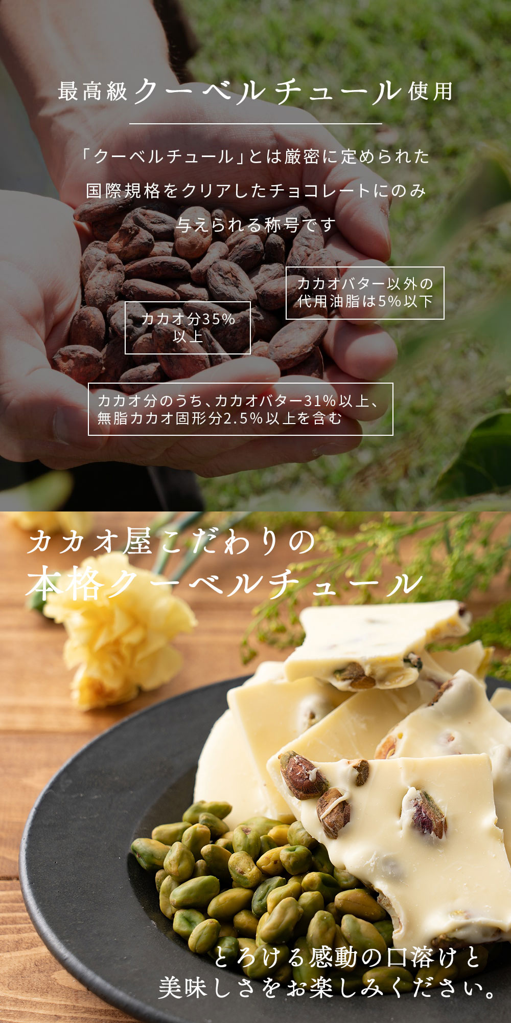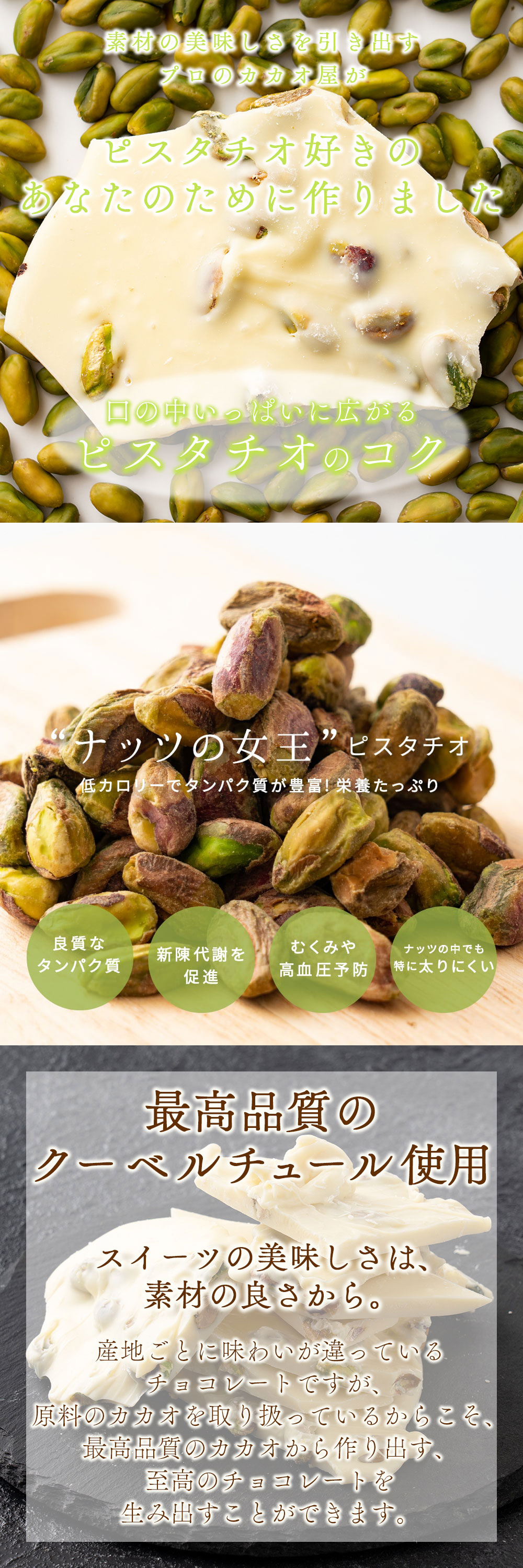 ・原材料/材質/素材:チョコレート(ココアバター、砂糖、全乳粉、脱脂粉乳)(日本製造)、ピスタチオ/乳化剤、香料、(一部に乳成分・大豆を含む)