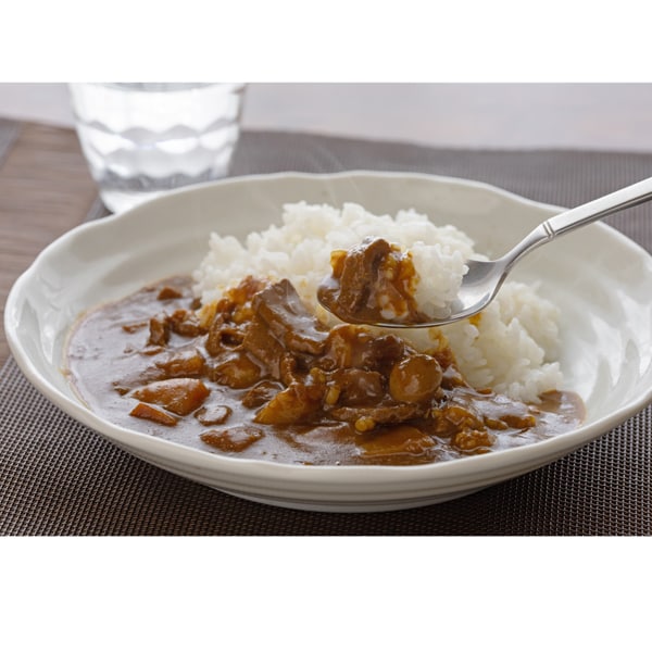 牛肉(国産)、ソテーオニオン(玉葱、食用油脂)、野菜(じゃがいも、人参)、マッシュルーム、リンゴパルプ、小麦粉、食用油脂、カレー粉、砂糖、食塩、肉エキス、ビーフオイル、トマトケチャップ、蛋白加水分解物、香辛料、チャツネ、澱粉/調味料(アミノ酸等)、カラメル色素、酸味料、香料、(一部に小麦・牛肉・大豆・鶏肉・りんご・ゼラチンを含む)
