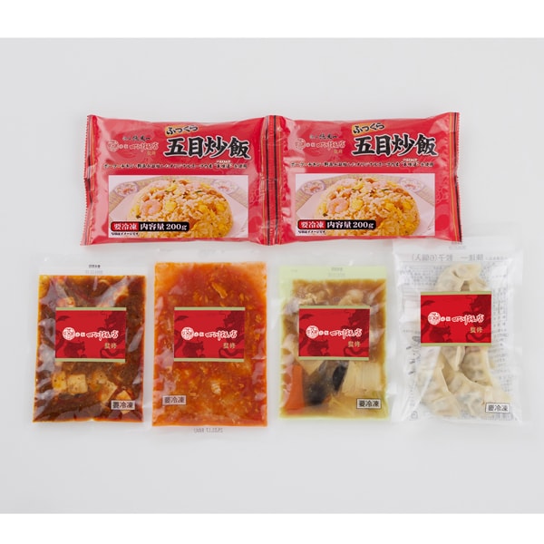 - 乾焼蝦仁(エビチリソース)150g、四川麻婆豆腐150g、餃子120g(6個入)、ふっくら五目炒飯(200g×2)、本格八宝菜150g×各1