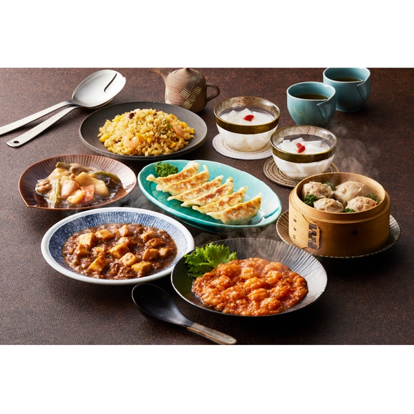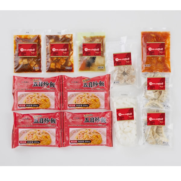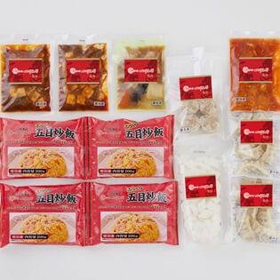 - 四川麻婆豆腐150g、餃子120g(6個入)、ふっくら五目炒飯(200g×2)×各2、乾焼蝦仁(エビチリソース)150g、貝柱入焼売120g(4個入)、杏仁豆腐500g、本格八宝菜150g×各1