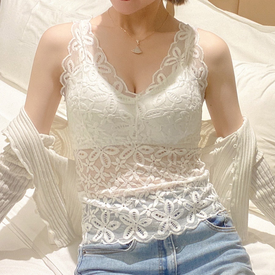 - 【ベージュ】総レースフラワータンクトップ(カップ付き)
