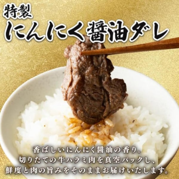 ●人気の牛ハラミ肉を、特製にんにく醤油ダレに漬け込みました。ゴハンやお酒がススムこと間違いなし!