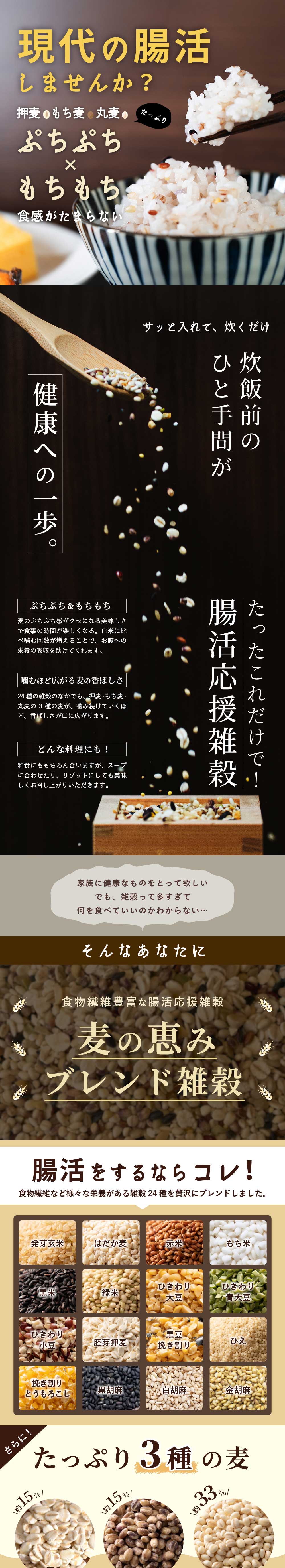丸麦、押麦、もち麦、はだか麦、もち米、大豆挽き割り、黒米、赤米、発芽玄米、緑米、ひきわり青大豆、小豆挽き割り、胚芽押麦、きび、黒豆挽き割り、高きび、とうもろこし、はとむぎ、ひえ、アマランサス、あわ、白胡麻、黒胡麻、金胡麻
