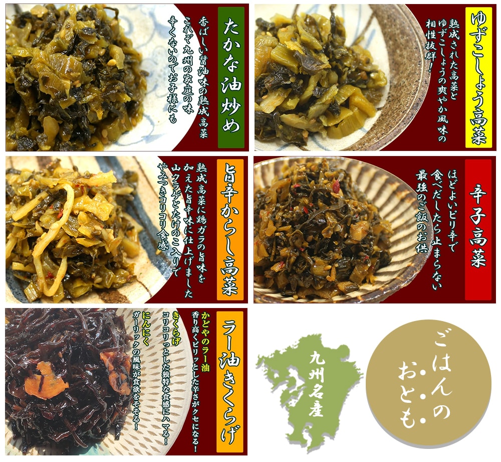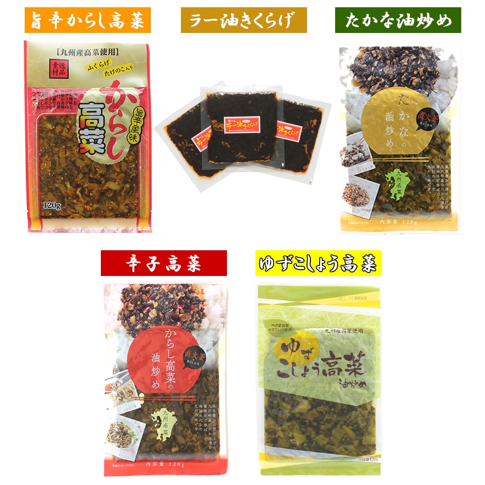 - (ゆずこしょう高菜120g、からし高菜の油炒め120g、たかな油炒め120g、旨辛風味からし高菜120g、ラー油きくらげ70g)