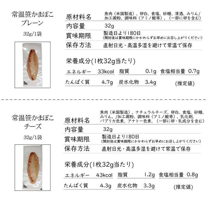 【プレーン味】魚肉(米国製造)、卵白、食塩、砂糖、清酒、みりん/ 加工澱粉、調味料(アミノ酸等)、(一部に卵を含む)