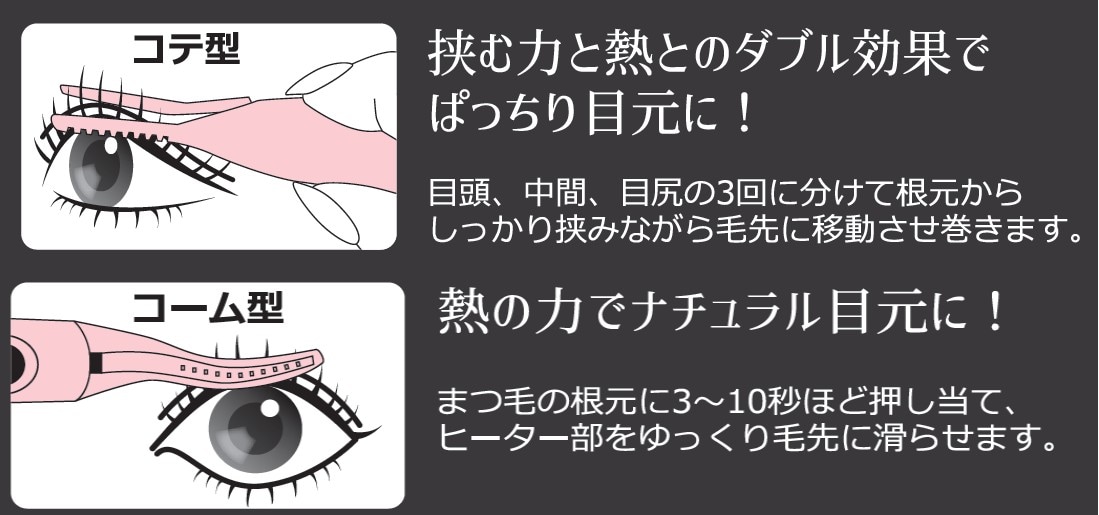 ・挟んで使うコテ型使用で、挟む力と熱とのダブル効果でぱっちり目元に。(目頭、中間、目尻の3回に分けて根元からしっかり挟みながら毛先に移動させ巻きます)