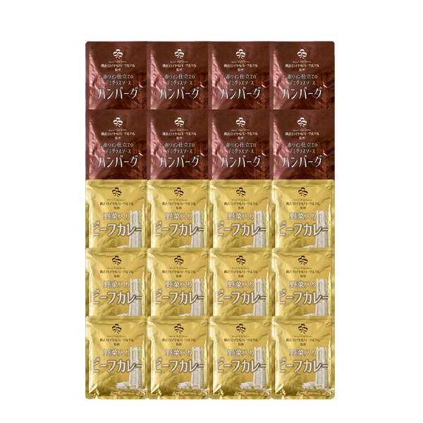 - 野菜入りビーフカレー200g×12、赤ワイン仕立てのデミグラスソースハンバーグ180g×8