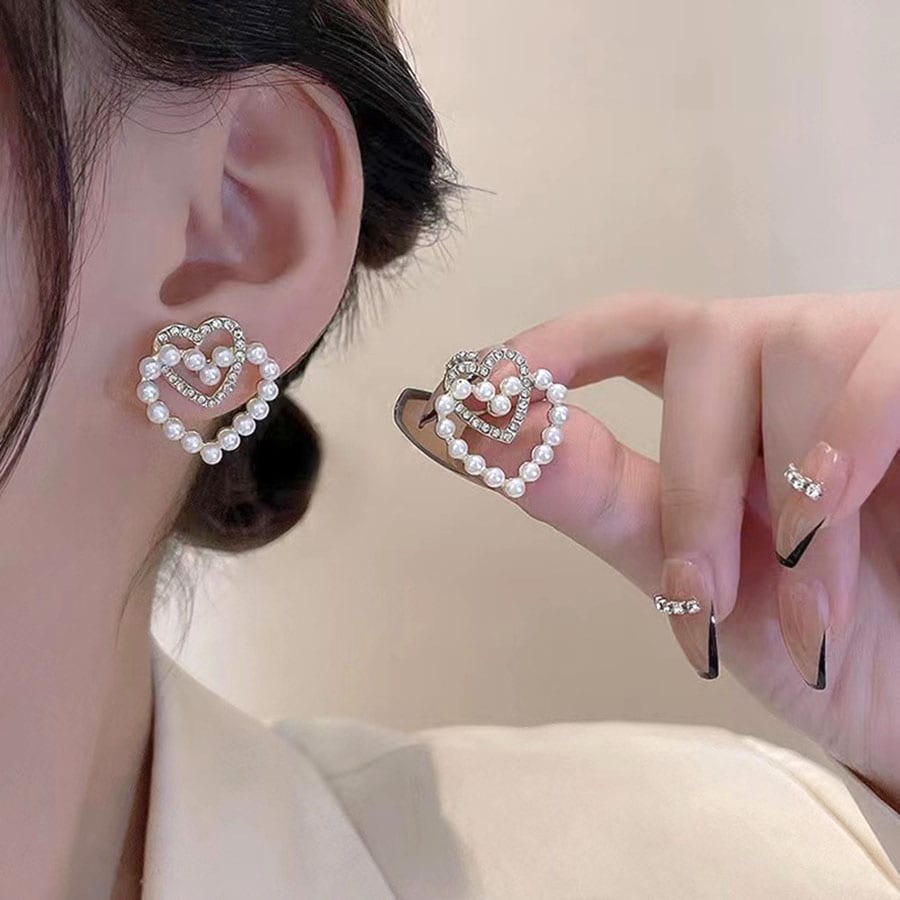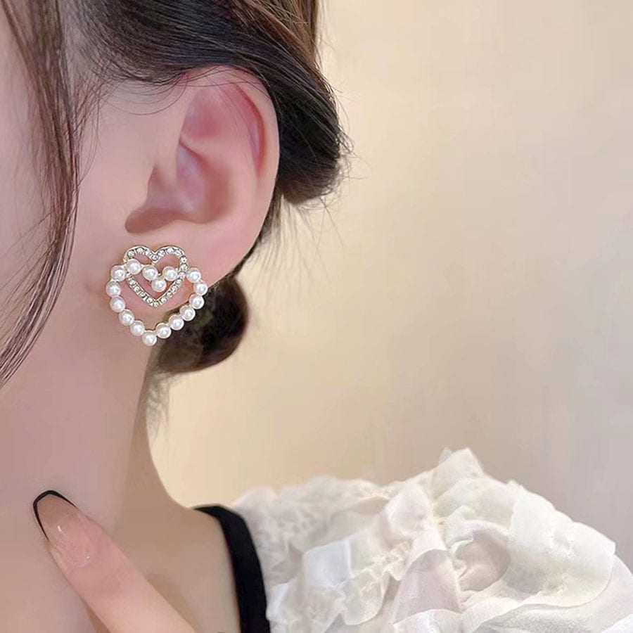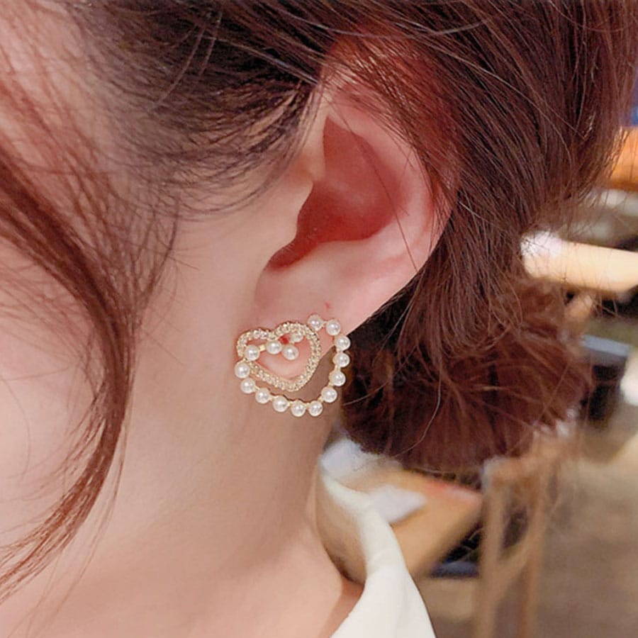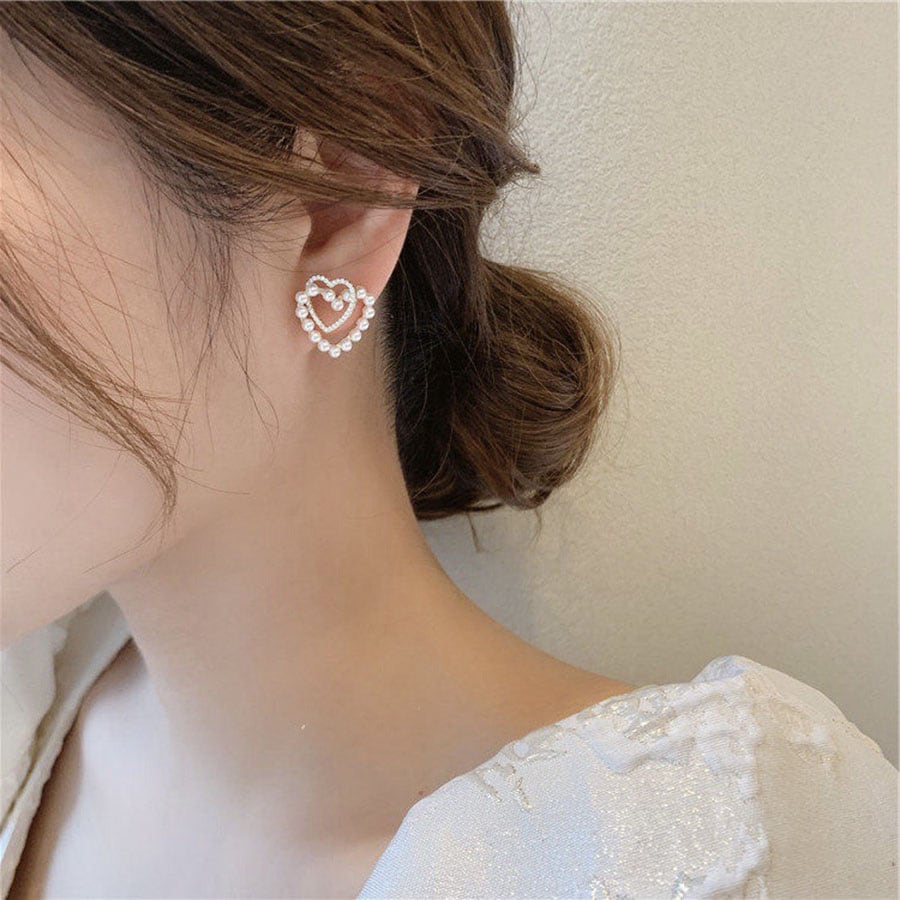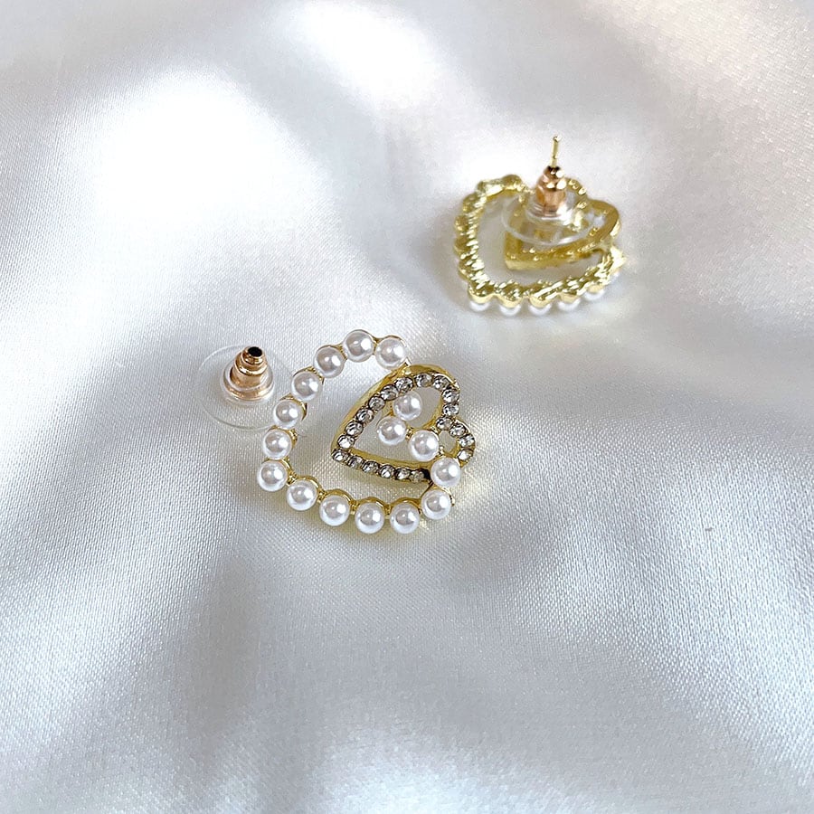 - 【シルバー】ハートモチーフ パール×ストーンスタッドピアス