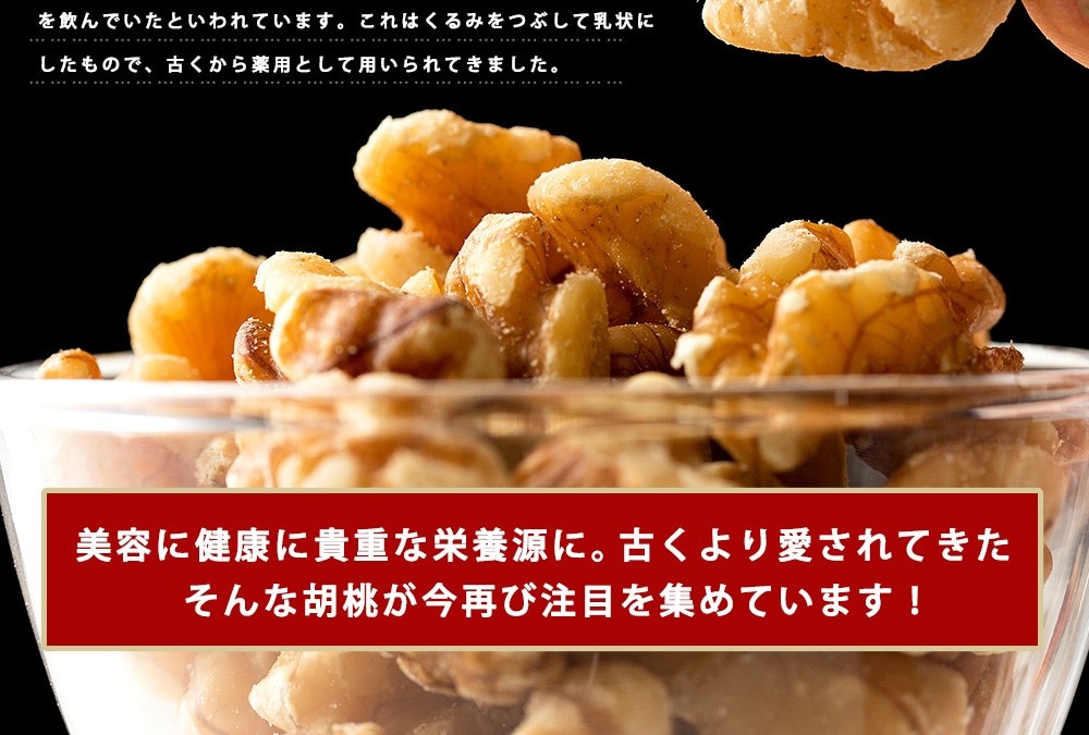 くるみは今注目されている栄養豊富な話題のスーパーフードです。くるみは、話題のアルファリノレン酸(オメガ3脂肪酸)をナッツ類でくるみだけが豊富に含んでいます。くるみを使った料理やスイーツ作りにも幅広くご利用いただけます。無添加の生くるみです。ローストをしてお召し上がりいただくのはもちろん、サラダや炒めものに加える直前に軽くローストすると風味と食感がさらに引き立ちます。