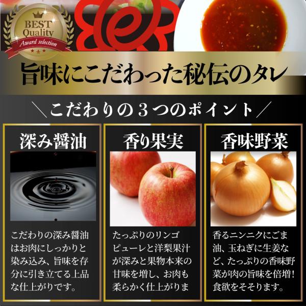 ・原材料/材質/素材:牛肉(国産、アメリカ産、オーストラリア産)、本みりん(国内製造)、本醸造しょうゆ、ぶどう糖果糖液糖、砂糖、米みそ、りんご、食塩、醸造酢、ごま、にんにく、生姜、植物油脂、ごま油、ラー油、発酵調味料、乾燥玉ねぎ、リンゴピューレ、濃縮西洋なし果汁、ビーフエキス、香辛料/調味料(アミノ酸等)、増粘剤(加工でん粉、キサンタンガム)、カラメル色素、酒精、V.B₁、酸味料、香料、香辛料抽出物(一部に小麦・大豆・りんご・ごま・乳成分・豚肉・鶏肉・ゼラチンを含む)