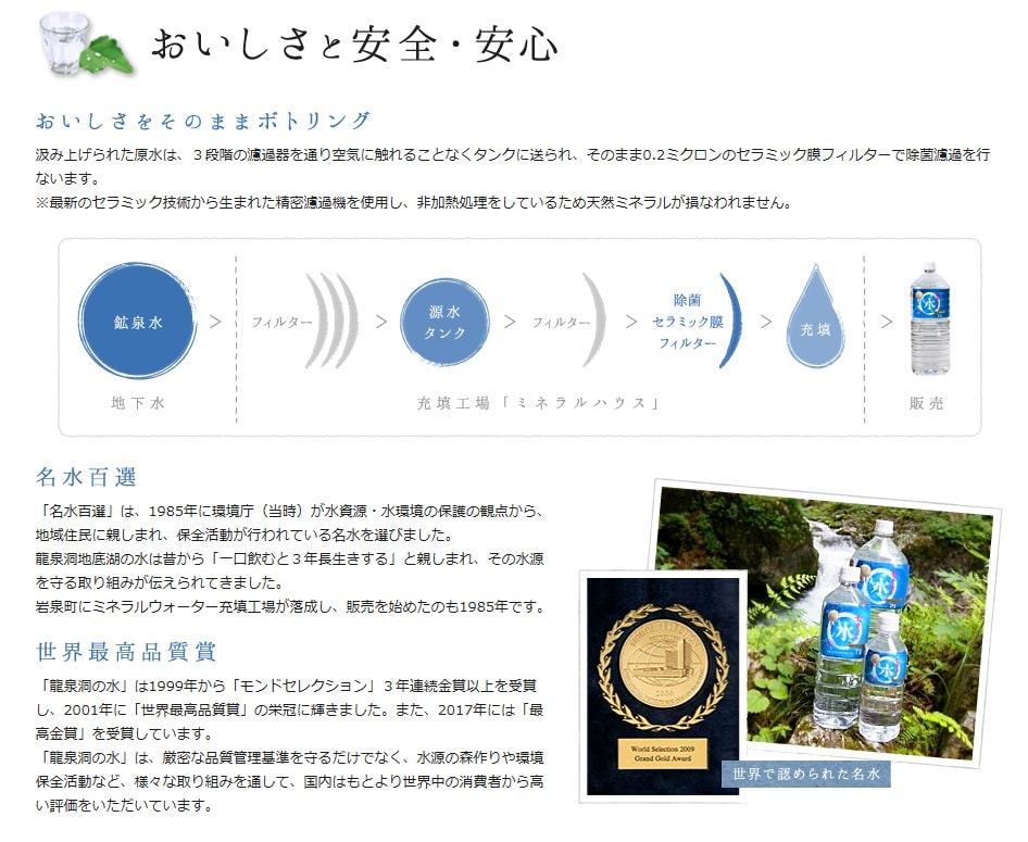 龍泉洞から湧き出た原水をセラミック膜フィルターで濾過し、非加熱充填した「ナチュラルミネラルウォーター」です。国内のミネラルウォーターの中ではカルシウム含有量が多く、比較的硬度の高い軟水です(硬度85.7mg/L)。pHは8.0の弱アルカリ性です。