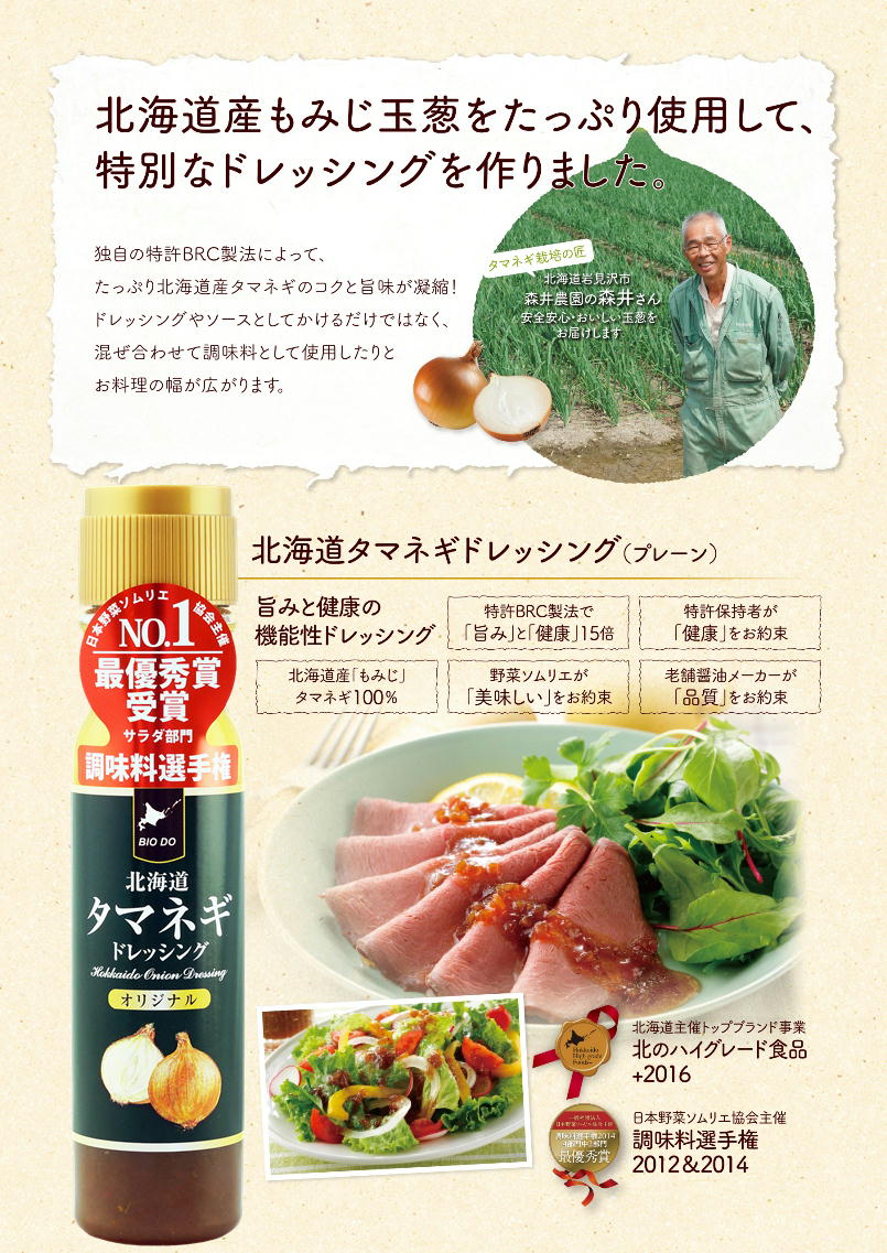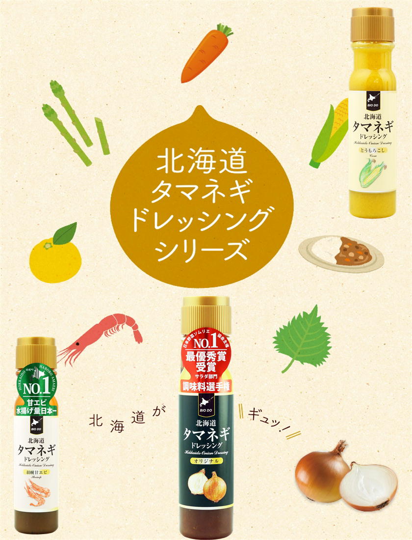 ◇独自の特許「BRC製法」で加工することによって、玉葱の旨み・健康成分を一般の加工と比較して15倍にまで高めた道産玉葱使用のドレッシング。1 本にダイスカット状の玉葱50gを使用し、他の玉葱ドレッシングとは香り・味わいが違います。