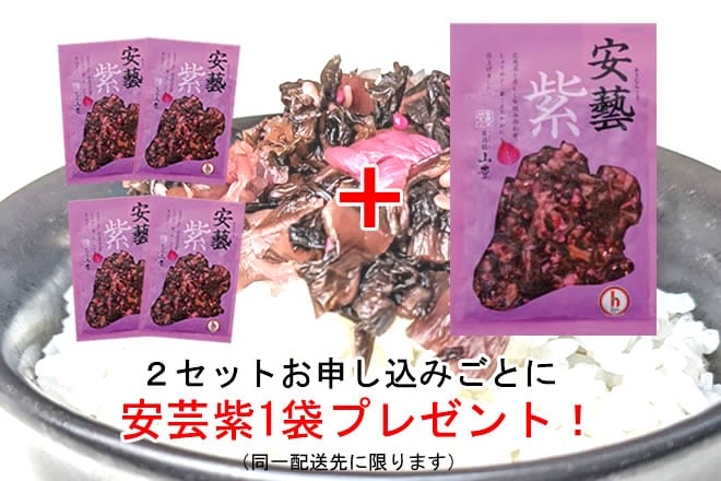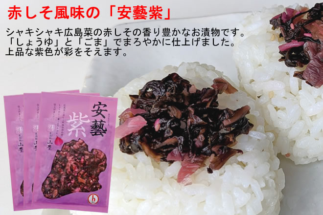 【2袋】日本三大漬菜・広島菜のお漬物 「安藝紫」、赤しその香り豊かなお漬物です。 | 「しょうゆ」と「ごま」でまろやかに仕上げました。※2セット同時申込で1袋プレゼント!