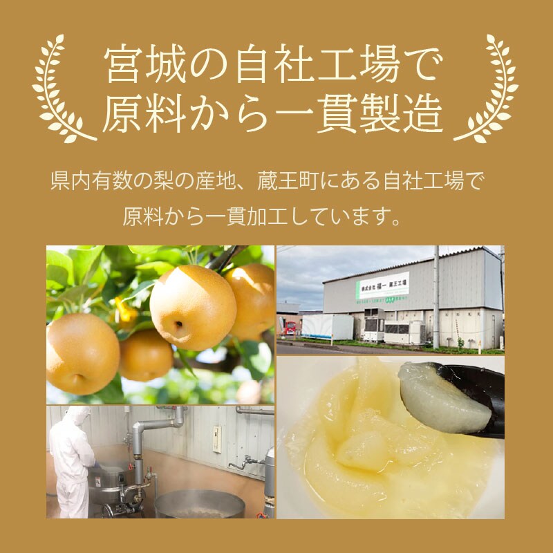 ・原材料/材質/素材:梨(宮城県産)、砂糖/トレハロース、ゲル化剤(増粘多糖類)、参加防止剤(ビタミンC)、酸味料、香料