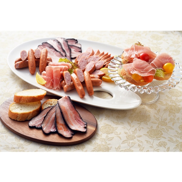 DLG(ドイツ農業協会)国際品質競技会で金賞受賞した農家のベーコンはそのまま焼くとジューシーな味わいです。北海道産にこだわったソーセージやポークローフ、ドイツ岩塩でまろやかに仕上げた生ハム、スライスタイプのロースハムが入ったバラエティ豊かなセットです。