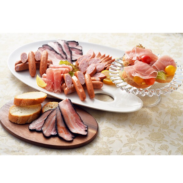 - 農家のベーコン400g、農家の白いベーコン400g、ボンレスハム300g、パストラミ肩ロースハム300g、サッポロ焼豚300g、チーズウインナー100g、玉葱ウインナー100g、ポークグルメフランク120g、ポークローフ170g、レバーペースト100g、ロースシンケン40g