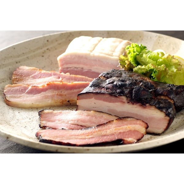 DLG(ドイツ農業協会)国際品質競技会金賞受賞した農家のベーコン2種類のセット。表面が黒い「農家のベーコン」は調味時に水分を加えない“乾塩法”で製造していることで肉の旨味を存分に堪能できます。「農家の白いベーコン」は牛乳を含む調味液に漬け込むことでまろやかでやわらかな味わいに仕上がっております。どちらも厚切りにしてステーキ風に焼くのがおすすめです。そのほか、野菜と一緒時スープにいれても美味です。