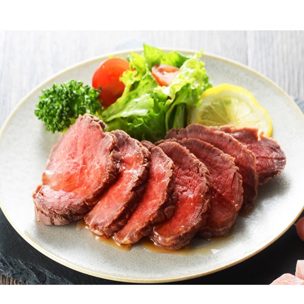 ドイツ岩塩と牛肉のみでつくった、こだわりのローストビーフ。赤身肉が美味しい牛もも肉を厳選し、丁寧に塩をすり込み、熟練の職人が手焼きしたローストビーフ。素材の旨味を引き出した一品です。まずは、スライスしてそのまま、さらに付属のたれをつけてお召し上がりください。