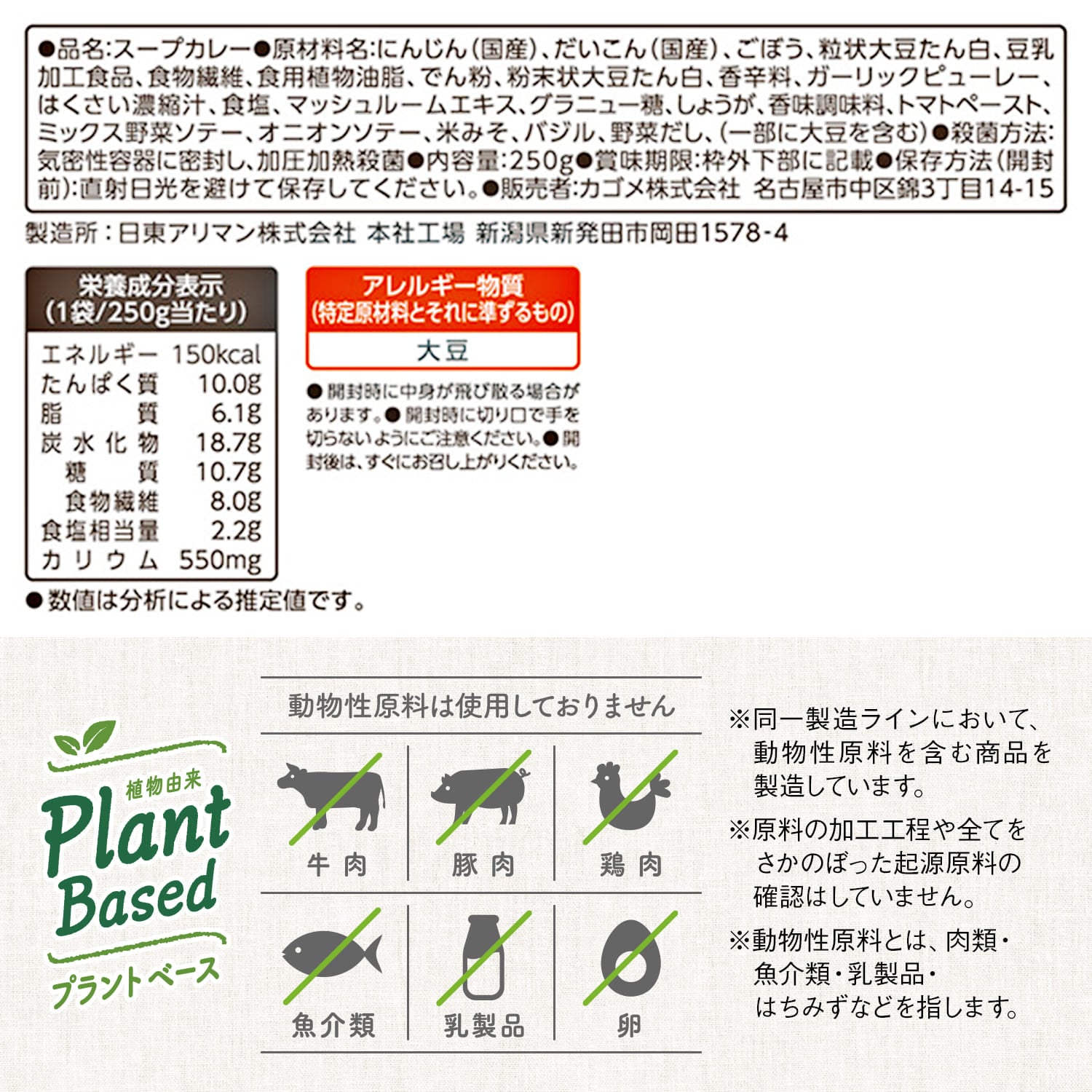 ごろっとした具材感の根菜も入って、たっぷり内容量250gです。動物性原料不使用※でも食べ応えのあるスープカレーに仕上げました。※同一製造ラインにおいて、動物性原料を含む商品を製造しています。※原料の加工工程や全てをさかのぼった起原原料の確認はしていません。※動物性原料とは、肉類・魚介類・卵・乳製品・はちみつなどを指します。