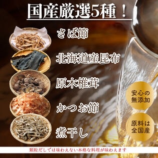 ・原材料/材質/素材:食塩(国内製造)、酵母エキス、砂糖、鯖節、宗田鰹節、いわし煮干し、粉末昆布、乾椎茸、粉末醤油(食塩(国内製造)、酵母エキス、砂糖、鯖節、宗田鰹節、いわし煮干し、粉末昆布、乾椎茸、粉末醤油(大豆・小麦・さばを含む)