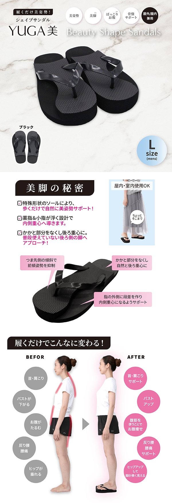 【メンズ/ブラック/L】YUGA-美シェイプサンダル | 履くだけ美姿勢!Beauty Shape Sandals