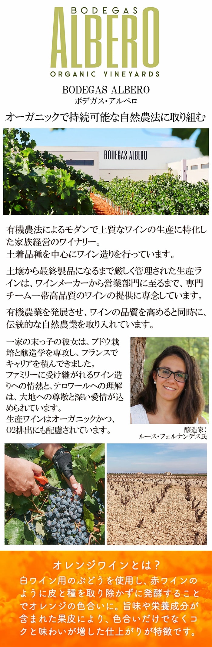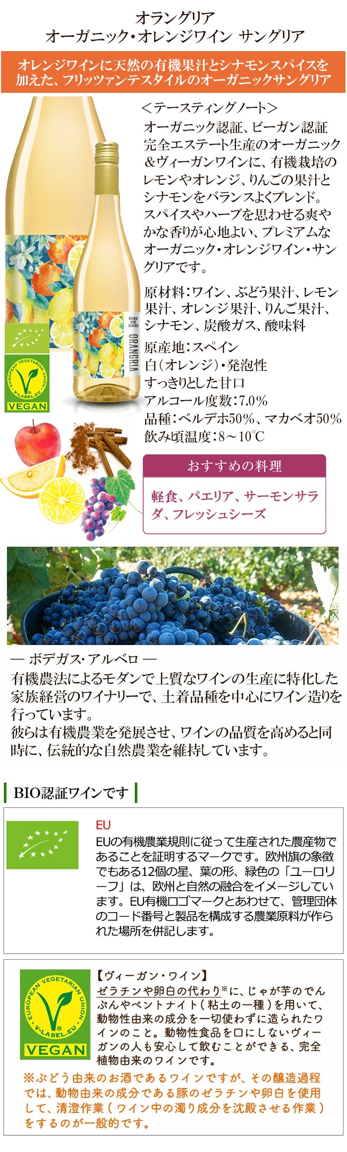・オラングリア オーガニック・オレンジワイン サングリア:原材料 / ワイン、ぶどう果汁、レモン果汁、オレンジ果汁、りんご果汁、シナモン / 炭酸ガス、酸味料