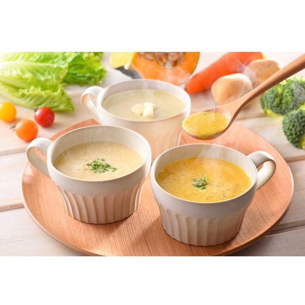 蓮根とほうれん草のスープ[牛乳(国内製造)、カット野菜(れんこん、ほうれん草、白菜、キャベツ、大根、人参、じゃがいも、なす、玉ねぎ、ごぼう、枝豆、とうもろこし、大豆)、野菜ペースト(グリーンリーフ、小松菜、ケール、米麹、その他)、白ワイン、乳等を主要原料とする食品、食塩不使用バター、チキンパウダー、かつお節エキス、でん粉、たん白加水分解物、ナチュラルチーズ、食塩、酢酸発酵調味料、(一部に乳成分・鶏肉・りんご・大豆・ごまを含む)]、コーンスープ[牛乳(国内製造)、カット野菜(とうもろこし、白菜、キャベツ、大根、人参、じゃがいも、なす、玉ねぎ、ごぼう、枝豆、大豆)、野菜ペースト(グリーンリーフ、小松菜、ケール、米麹、その他)、白ワイン、乳等を主要原料とする食品、食塩不使用バター、チキンパウダー、かつお節エキス、でん粉、たん白加水分解物、ナチュラルチーズ、食塩、酢酸発酵調味料、(一部に乳成分・鶏肉・りんご・大豆・ごまを含む)]、かぼちゃスープ[牛乳(国内製造)、カット野菜(かぼちゃ、白菜、キャベツ、大根、人参、じゃがいも、なす、玉ねぎ、ごぼう、枝豆、とうもろこし、大豆)、野菜ペースト(グリーンリーフ、小松菜、ケール、米麹、その他)、白ワイン、乳等を主要原料とする食品、食塩不使用バター、チキンパウダー、かつお節エキス、でん粉、たん白加水分解物、ナチュラルチーズ、食塩、酢酸発酵調味料、(一部に乳成分・鶏肉・りんご・大豆・ごまを含む)]、ねぎスープ[牛乳(国内製造)、カット野菜(白ネギ、生姜、白紙阿、キャベツ、大根、人参、じゃがいも、なす、玉ねぎ、ごぼう、枝豆、とうもろこし、大豆)、野菜ペースト(グリーンリーフ、小松菜、ケール、米麹、その他)、白ワイン、乳等を主要原料とする食品、食塩不使用バター、チキンパウダー、かつお節エキス、でん粉、たん白加水分解物、ナチュラルチーズ、食塩、酢酸発酵調味料、(一部に乳成分・鶏肉・りんご・大豆・ごまを含む)]