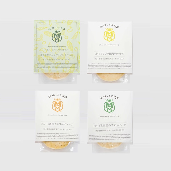 - 蓮根とほうれん草のグリーンポタージュ180g、とうもろこしの贅沢ポタージュ180g、とろーり濃厚かぼちゃのスープ180g、白ネギと生姜の煮込みスープ180g