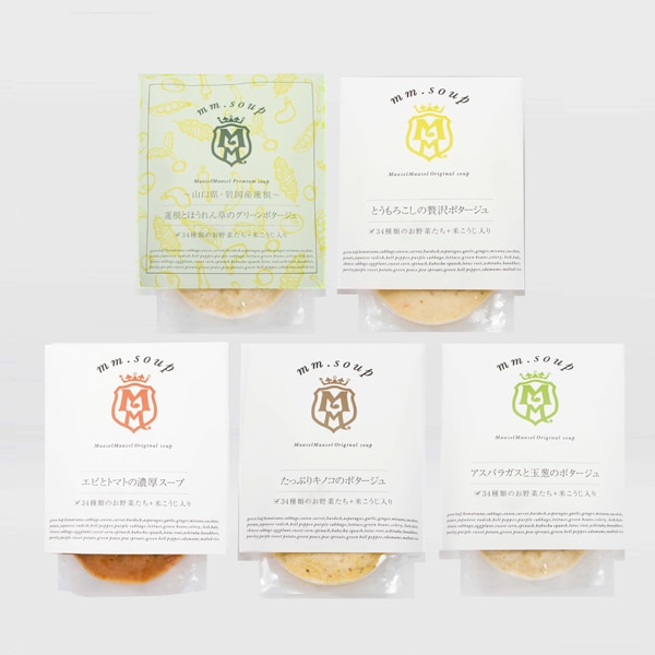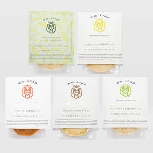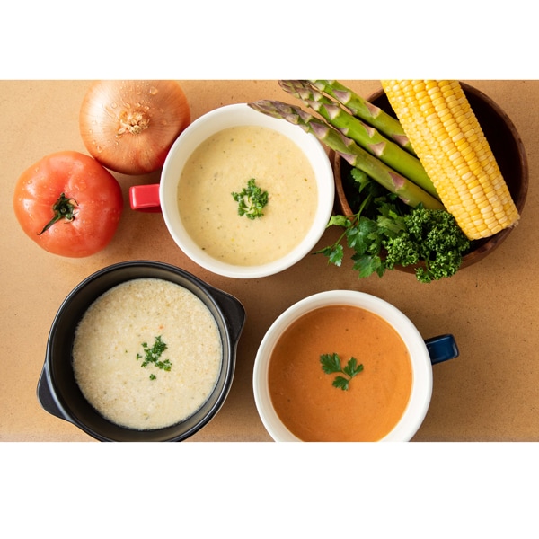 - 蓮根とほうれん草のグリーンポタージュ180g、とうもろこしの贅沢ポタージュ180g、エビとトマトの濃厚スープ180g、たっぷりキノコのポタージュ180g、アスパラガスと玉葱のポタージュ180g