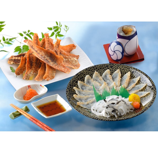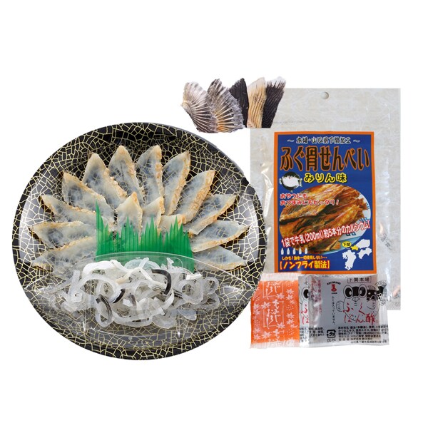 真ふくを軽く炙ってうまみを閉じ込めた真ふくたたき刺身と、こりこり食感のとらふく皮、そしてしろさばふくの骨をそのまま炙りあげたふく骨せんべいをセットにしました。ヒレ酒とともに晩酌のお供としてお楽しみください。