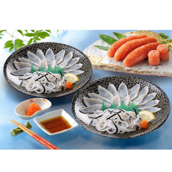 ふくの身を熱湯にサッとくぐらせた後、氷水に浸けることにより旨味を閉じ込めた真ふく霜降り刺身とコクのある辛さの辛子明太子を詰め合せにしました。