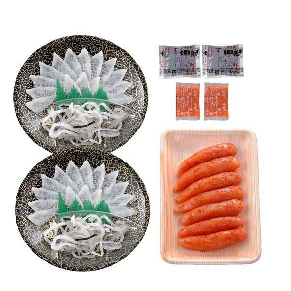 - 真ふぐ霜降り刺身(17cm皿)20g×2、とらふぐ皮20g×2、辛子明太子250g、ふくポン酢10g×2、もみじおろし10g×2