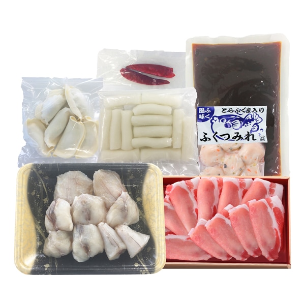 ちり[ゴマフグ(石川県産)]、旨辛鍋のタレ[しょうゆ、みりん、かつお節エキス、こんぶエキス、コチュジャン調味料、かつお節、食塩、ニンニク、生姜、唐辛子/調味料(アミノ酸)、トウガラシ色素、増粘剤(キサンタンガム)、(一部に大豆・小麦を含む)]、しゃぶしゃぶ用豚肉[黒豚(鹿児島県産)、(一部に豚肉を含む)]、トッポッキ[米、ジャガイモ澱粉、塩/清酒]、水餃子[皮(小麦粉、コーンスターチ、食塩)、野菜(キャベツ、ニラ、しょうが)、豚肉、豚脂、醤油、パン粉、ごま油、砂糖、塩、味噌、酒、香辛料/加工澱粉、調味料(アミノ酸等)、(一部に小麦・豚肉・大豆・ごまを含む)]、ふぐつみれ[魚肉(スケソウダラ、イトヨリダイ)、トラフグ皮、馬鈴薯澱粉、小麦澱粉、食塩、ねぎ、人参、唐辛子/保存料(ソルビン酸、しらこ蛋白)、調味料(アミノ酸等)、甘味料(天草、ステビア)、(一部に小麦・さけ・大豆を含む)]、鷹の爪[唐辛子]