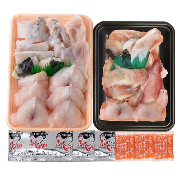 ちり[トラフグ(長崎県産、熊本県産:養殖)、シロサバフグ(福岡県産、長崎県産)]、あんこう[アンコウ(山口県産)]、ふく醤油[醤油、米発酵調味料、糖類(砂糖、水飴)、かつお節エキス、橙果汁、橙油/酸味料、調味料(アミノ酸等)、アルコール、カラメル色素、(一部に小麦・大豆を含む)]、もみじおろし[大根、澱粉、唐辛子、こんにゃく粉、梅酢]