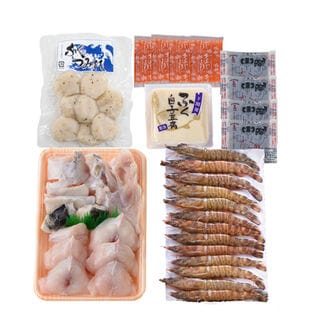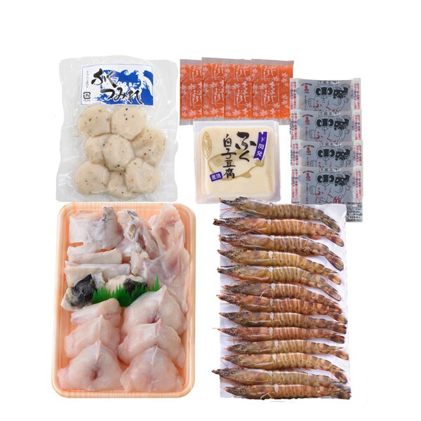 - ふぐちり(シロサバフグ切身、トラフグアラ)360g、車海老(刺身用)200g、ふぐ白子豆腐130g、ふぐつみれ100g、ふくポン酢10g×4、もみじおろし10g×4