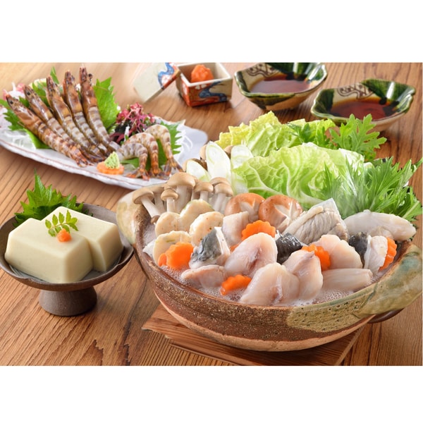 美味しさ溢れるふくちり鍋と、プリプリとした食感で甘味のある車海老の刺身セットです。とらふく白子を使用した風味豊かなふく白子豆腐とお好みの野菜を入れて、ふくのちり鍋をお楽しみください。車海老は鍋でしゃぶしゃぶにしても美味しくお召し上がりいただけます。