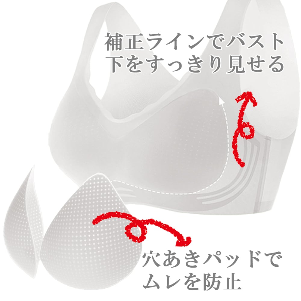 通気性に優れた穴あきパッドが熱を逃し、ムレを防いでさらっと快適。バスト周りの不快な汗も気にならず、爽やかな着け心地が続きます。