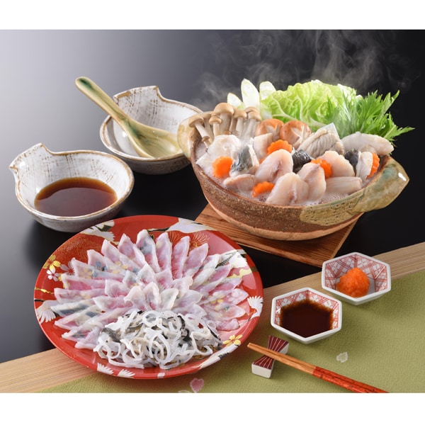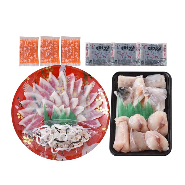 ちり[トラフグ(長崎県産、熊本県産:養殖)、シロサバフグ(福岡県産、長崎県産)]、刺身[マフグ(山口県産)]、刺身[トラフグ(長崎県産、熊本県産:養殖)]、ふくポン酢[醤油、柑橘果汁(橙、かぼす)、醸造酢、米発酵調味料、かつおエキス、昆布エキス、食塩/調味料(アミノ酸等)、(一部に小麦・大豆を含む)]、もみじおろし[大根、澱粉、唐辛子、こんにゃく粉、梅酢]
