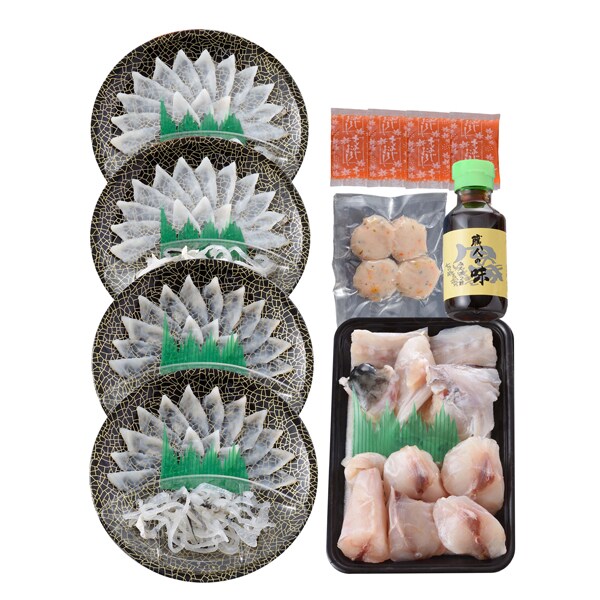 ちり(加熱用)[トラフグ(長崎県産、熊本県産:養殖)、シロサバフグ(福岡県産、長崎県産)]、ふくポン酢[醤油、醸造酢、ゆず果汁、砂糖、かつおエキス、昆布エキス、米発酵調味料、食塩/調味料(アミノ酸等)、(一部に小麦・大豆を含む)]、皮[トラフグ(長崎県産、熊本県産:養殖)]、刺身[マフグ(山口県産)]、ふぐつみれ(魚肉(スケソウダラ、イトヨリダイ)、トラフグ皮、馬鈴薯澱粉、小麦澱粉、食塩、ねぎ、人参、唐辛子)、白菜、人参、小松菜、しいたけ、ぶなしめじ、柚子皮、スープ(ふぐスープ、しょうゆ、醸造調味料、食塩、こんぶだし)/調味料(アミノ酸等)、保存料(ソルビン酸、しらこ蛋白)、甘味料(天草、ステビア)、(一部に小麦・さけ・大豆を含む)]、もみじおろし[大根、澱粉、唐辛子、こんにゃく粉、梅酢] 、皮[トラフグ(長崎県産、熊本県産:養殖)]、刺身[トラフグ(長崎県産、熊本県産:養殖)]