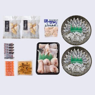 - とらふぐ刺身(17cm皿)15g×2、とらふぐ皮20g×2、ふぐちり(シロサバフグ切身、トラフグアラ)200g、ふぐ唐揚げ(油調済・骨付)80g×2、ふぐ煮こごり100g、ふぐつみれ80g、ふくポン酢10g×4、もみじおろし10g×4