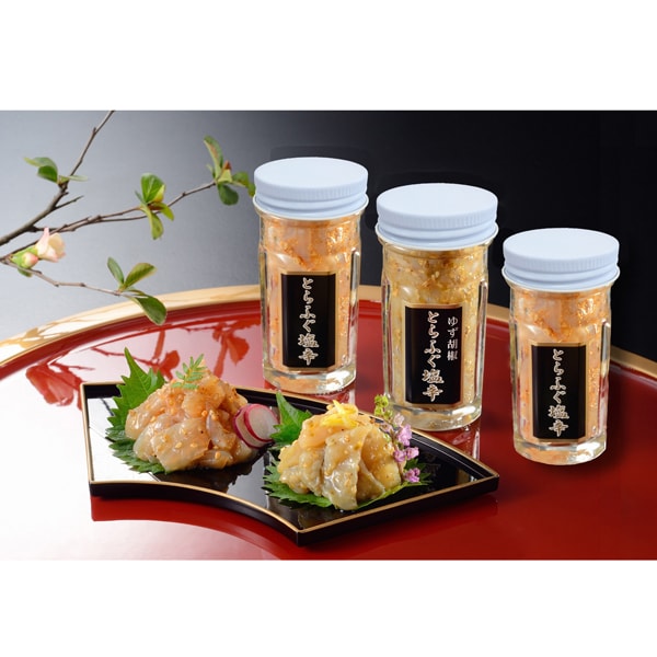【とらふぐ塩辛(ゆず胡椒風味)】トラフグ(国産)、味醂、ゆず胡椒、ごま、食塩、はちみつ、唐辛子/調味料(アミノ酸等)、pH調整剤、V.B1、増粘剤(キサンタンガム)、(一部に小麦・乳成分・ごまを含む)