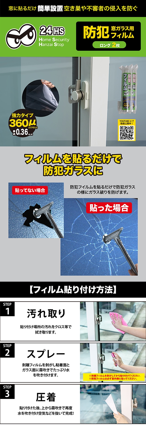 【ロング0.36mm/2枚】窓ガラス用防犯フィルム | 窓に貼るだけ!簡単設置で空き巣や不審者の侵入を防ぐ
