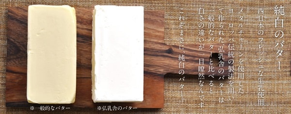 弘乳舎のバターは、九州を中心とする西日本産のフレッシュな生乳のみを使用しています。この生乳が純白の色の秘密なのです!! 塩は、徳島県産の”鳴門浜の焼塩”が使われてます。