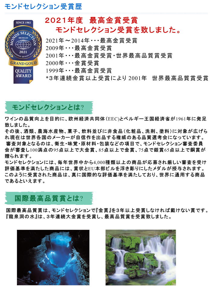 モンドセレクション最高金賞受賞!! 世界も認めた日本の名水です。