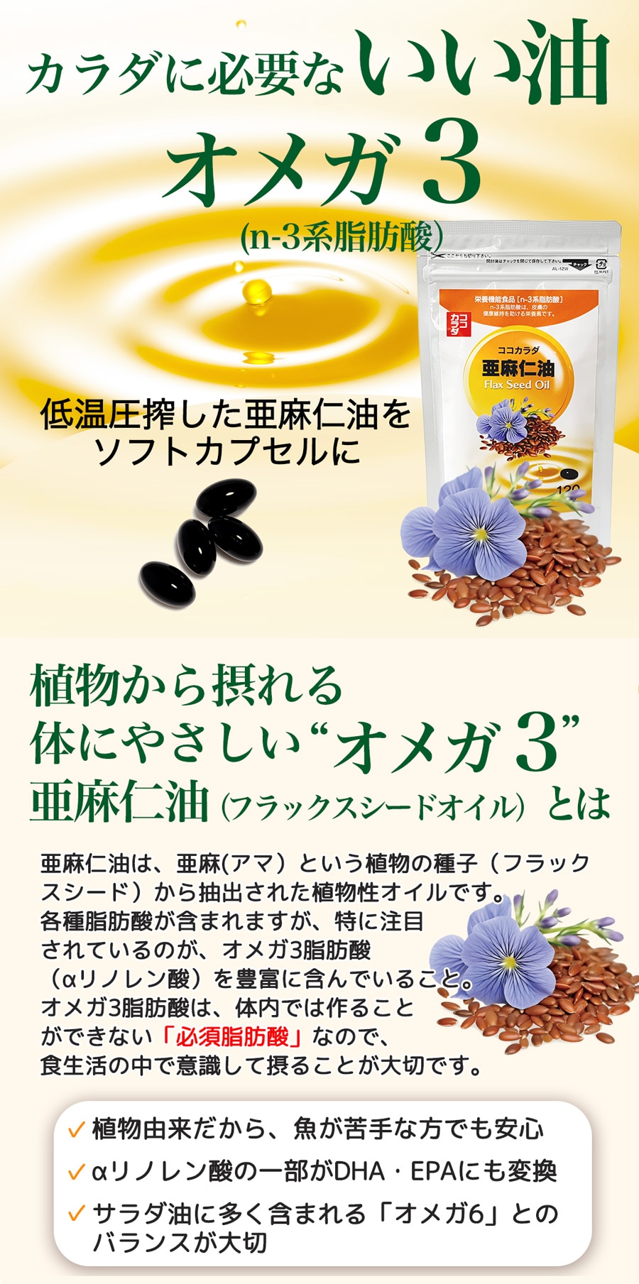 「ココカラダ 亜麻仁油 (アマニ油) 120カプセル」は、亜麻の種子(フラックスシード)から低温圧搾で抽出した亜麻仁油をカプセルに閉じ込めました。